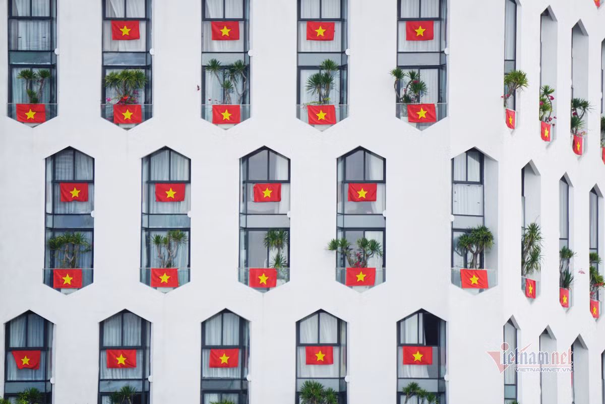 Một số tòa nhà tận dụng khoảng không gian ban công để treo cờ.