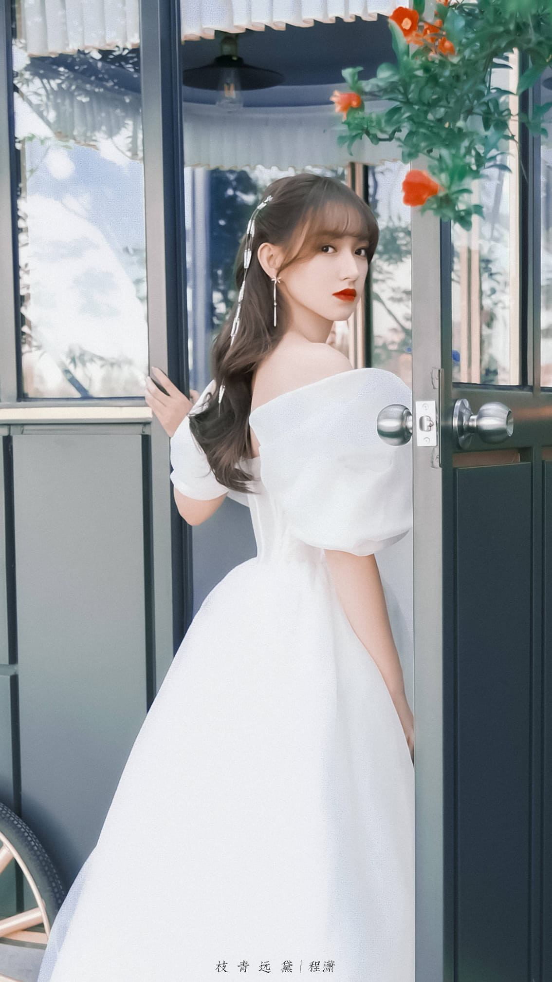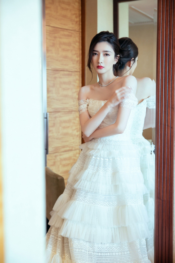 Giang Sơ Ảnh với chiếc đầm bồng bềnh khoe bờ vai mình hạc sương mai.
