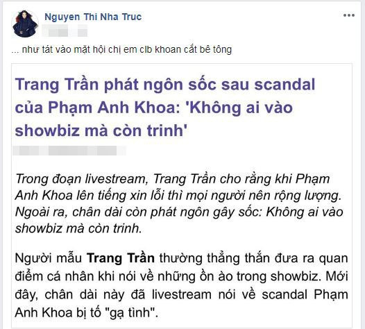 Khi bàn luận về scandal của Phạm Anh Khoa, Trang Trần có phát ngôn gây sốc rằng: "Phụ nữ bị gạ tình hay sàm sỡ sẽ rất bực, nhưng nếu là người thẳng thắn thì nói rõ luôn. Tưởng hiếp dâm mà dễ à? Xin lỗi, cái showbiz này thối lắm. Không có ai hiền và cũng chẳng có ai còn trinh khi vào showbiz đâu. Cái nghề vào showbiz sớm nhất là nghề múa và dancer bởi người ta học từ bé. Chưa kể cô đó còn là biên đạo múa nổi tiếng".