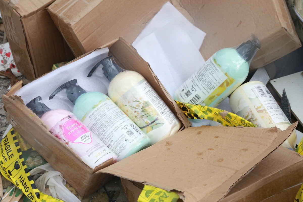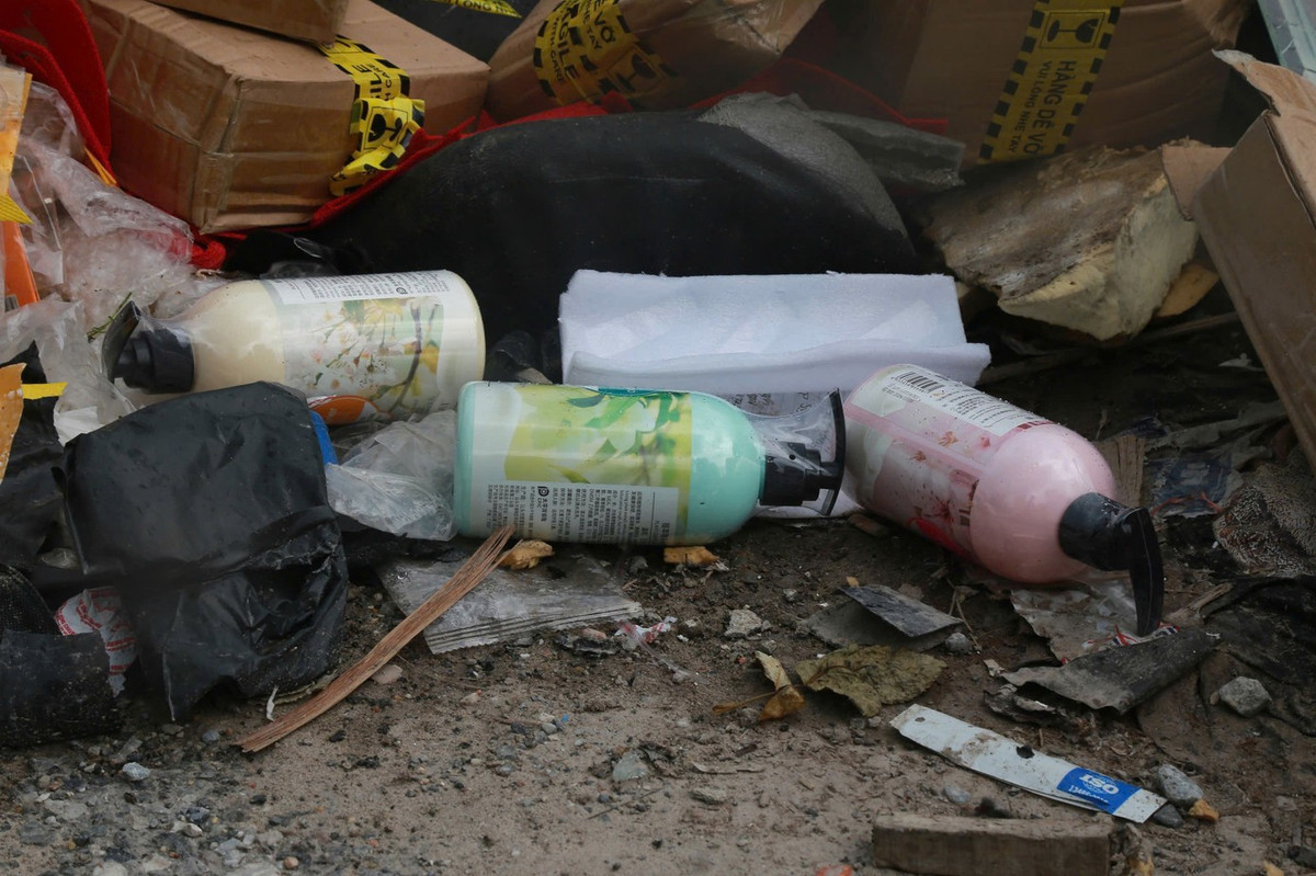 Hàng loạt hộp mỹ phẩm mang tên nước ngoài, không rõ nguồn gốc, bị vứt ngổn ngang tại bãi rác tự phát trên tuyến đường dang dở ở phường Từ Liêm (Hà Nội).