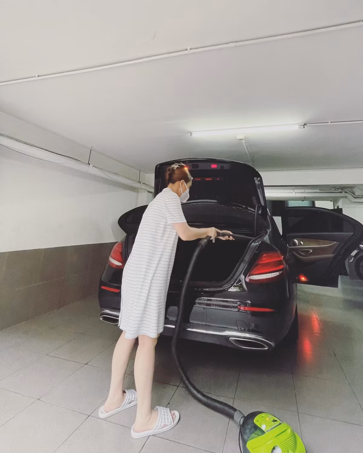 Giang Hồng Ngọc rửa xe, dọn sân nhà.