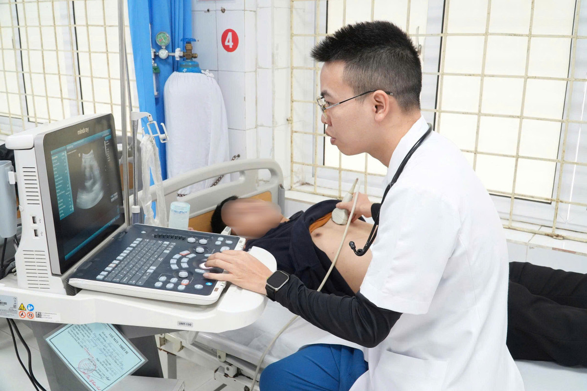 Bác sĩ CKI Lê Hoàng Linh – Phó Trưởng khoa Cấp cứu Bệnh viện Giao thông Vận tải siêu âm tim tại giường cho người bệnh. Ảnh BV
