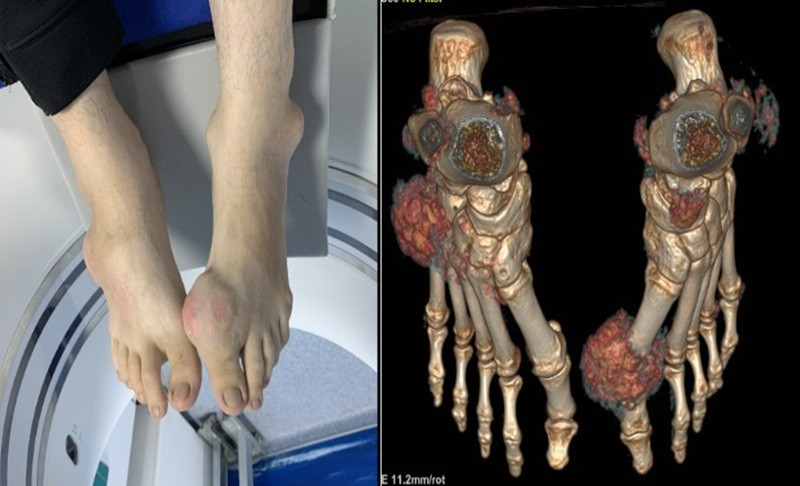 Tại thời điểm thăm khám, bác sĩ ghi nhận bệnh nhân tỉnh, tiếp xúc tốt, chỉ số BMI 27,6 (béo phì độ I). Hai bàn chân bệnh nhân có biến dạng khớp nặng, đặc biệt tại khớp bàn ngón chân cái hai bên. Nhiều khối tophi kích thước lớn lồi gồ dưới da, ranh giới không rõ, làm thay đổi trục khớp. Da vùng khớp căng, dày, một số vị trí đỏ nhẹ.