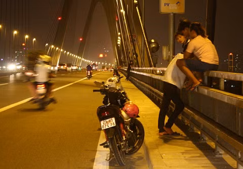 Bất chấp nguy hiểm, các cặp nam thanh nữ tú Hà thành ngồi vắt vẻo trên cầu Nhật Tân hóng gió và biến nơi đây thành điểm gặp gỡ tình yêu.