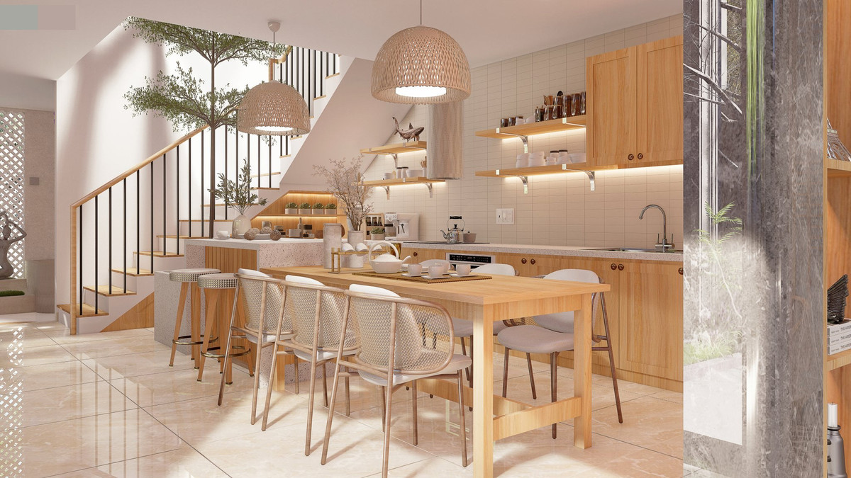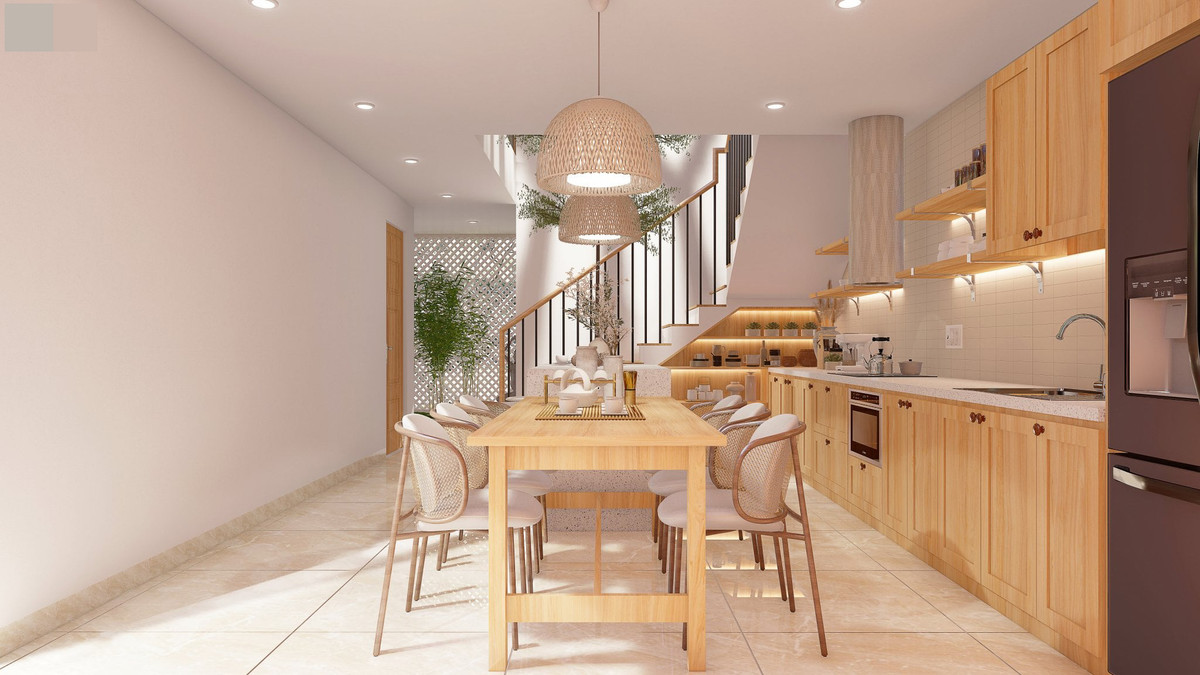 Phòng bếp + ăn bố trí 1 bàn ăn chính và 1 bàn ăn phụ+bàn đảo, phục vụ linh động cho gia đình khi ít người hoặc mời khách. Tiếp nối đó là cầu thang và khoảng giếng trời thông gió cùng cây xanh lọc khí tươi.