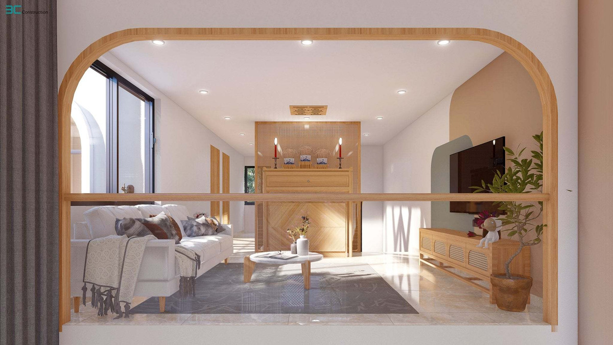 Đây là không gian tiếp giáp với khoảng thông tầng, được dùng làm nơi thờ và đặt bộ sofa xem phim.