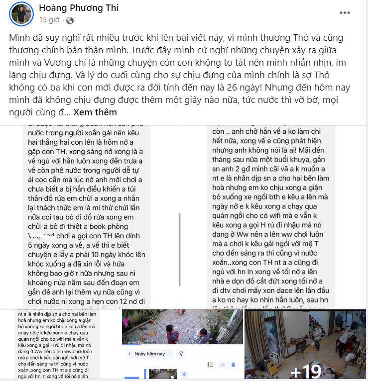 “Để đi quyết định như ngày hôm nay, mình đã tha thứ cho Vương biết bao nhiêu lần rồi, tự lừa dối bản thân mình là sẽ vì thương con mà từ bỏ cuộc chơi và những cô gái ngoài kia, hay là Vương sẽ bảo vệ mình trước gia đình Vương mặc dù Thi chẳng làm gì sai, nhưng Thi đã lầm”, cô đau đớn viết.