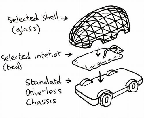 | Đây có thể là một loại xe của tương lai, chiếc xe không người lái với chỉ một chiếc giường bên trong, một hành khách duy nhất sẽ có thể nằm xuống ngủ một giấc trong khi xe vẫn tự đi đến đích mà người chủ muốn. |