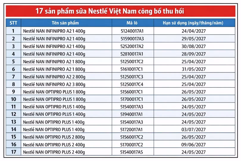 Ngày 8/1, Công ty TNHH Nestlé Việt Nam phát thông báo trên trang nestle.com.vn về việc thu hồi 17 lô sữa công thức dành cho trẻ nhỏ mang thương hiệu NAN, được nhập khẩu và phân phối tại thị trường Việt Nam. Các lô sản phẩm bị ảnh hưởng được doanh nghiệp công bố chi tiết theo tên sản phẩm, mã lô và hạn sử dụng.