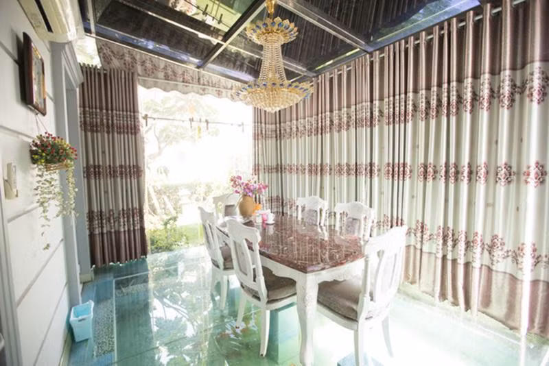 Để tâm hồn được thư thái, cô chọn màu sơn trắng làm tổng thể để hòa quyện với màu xanh mát của thiên nhiên. Mỗi góc nhỏ trong nhà đều được cô chăm chút tỉ mẩn. Trong đó không thể không nhắc đến phòng ăn đặc biệt với sàn làm bằng kính. Bước vào căn phòng, các vị khách sẽ bất ngờ khi phía dưới là làn nước trong vắt có cá bơi tung tăng.