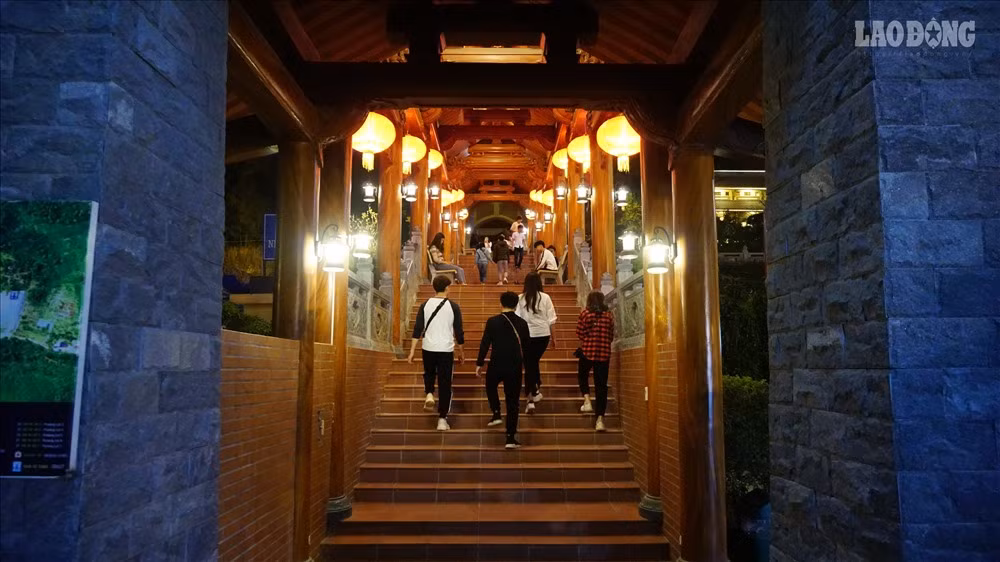 Chùa Ba Vàng lung linh khi về đêm, ngay cả hành lang cũng sáng điện phục vụ du khách tham quan chiêm ngưỡng cảnh thiền.