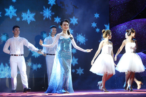 Dù thời tiết Hà Nội rất giá lạnh, hoa hậu Việt Nam 2014 vẫn lựa chọn chiếc váy ngắn, trễ vai bó sát tông trắng, chấm bi đen của nhà thiết kế Lê Thanh Hòa. Để giữ ấm cơ thể trong suốt 4 giờ diễn ra chương trình, thỉnh thoảng, cô phải khoác chiếc áo dạ màu kem bên ngoài. Chiếc váy ôm sát cũng khiến người đẹp khá run và bối rối khi lên, xuống cầu thang để trao hoa cho người thắng cuộc.