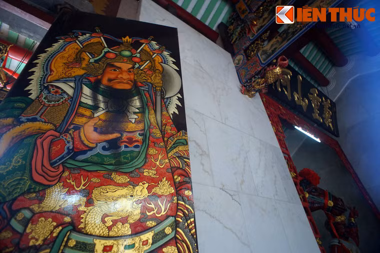 Tượng Quan Thánh đế quân được làm bằng thạch cao sơn màu, cao 3 m, mang những chi tiết đã trở thành qui ước: mặt đỏ, râu năm chòm dài đến ngực, tư thế đưa tay vuốt râu, đầu đội mão gắn kim hoa, mặc giáp trụ bên trong và áo bào xanh lá cây bên ngoài.