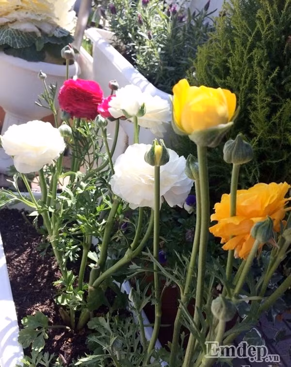Với hoa tulip, lily, dạ lan hương, hoa huệ tây chị Quỳnh mua củ về ươm trồng. Các loài hoa khác, có loài chị mua cây con như hồng, sakura, cẩm tú cầu, có loài chị gieo hạt như cúc, dạ yến thảo, pansy... Với hoa hồng, hoa sen, cẩm tú cầu thì mỗi năm chị thường thay đất một lần, tranh thủ thời gian rảnh rỗi chị cắt tỉa bớt rễ, thêm phân bón cho cây tốt tươi và ra nhiều hoa hơn vào vụ sau.