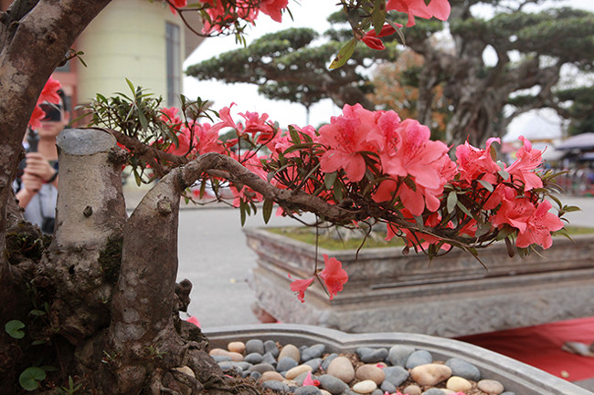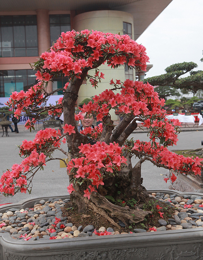 Cây đỗ quyên gần 400 tuổi, đường kính gốc 46cm, dáng cây uốn lượn, hoa nở đỏ rực từ gốc lên ngọn được chào bán với giá 860 triệu đồng tại triển lãm tỉnh Bắc Ninh.