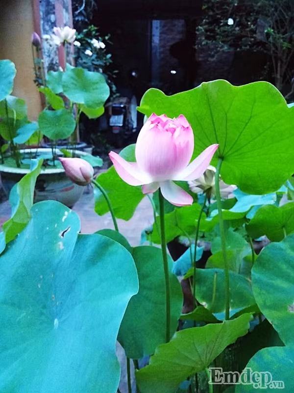 Mảnh sân nhỏ phía dưới nhà cổ cũng được anh Hồng Điệp đặt gần chục chậu sen với kích cỡ khác nhau.