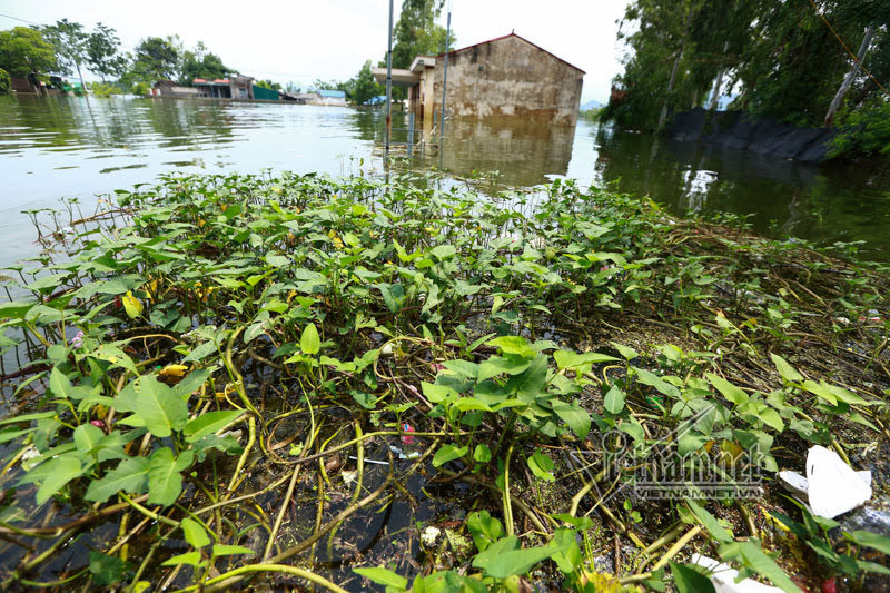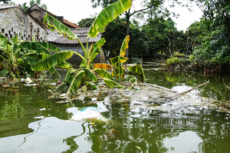 Nhiều ngày nay, người dân thôn Nam Hài, xã Nam Phương Tiến (Chương Mỹ, Hà Nội) khốn khổ vì bãi rác dân sinh của xã theo nước lũ tràn vào sân nhà, bốc mùi hôi thối khủng khiếp. Không còn cách nào khác, mọi người thay phiên nhau lội nước vớt chất thải cho vào bao tải. Ảnh: Rác thải tràn ngập từ đầu làng đến tận nhà dân do lụt ở Chương Mỹ.
