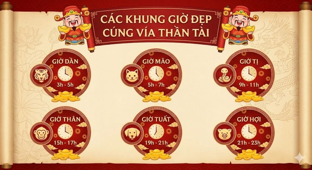 Khung giờ đẹp để cúng vía Thần Tài 2026 bao gồm: