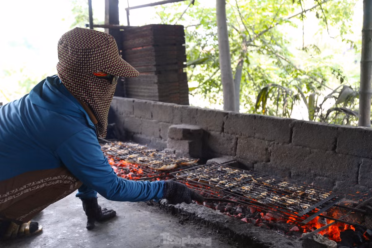 11 giờ trưa, khi nhiệt độ lên tới gần 40 độ C, khuôn mặt bà Hoàng Thị Hoa (53 tuổi, trú xóm Xuân Bắc, xã Diễn Vạn) đỏ rần rần. Nhễ nhại mồ hôi, bà vẫn kiên trì ngồi bên bếp than đỏ rực, tay liên tục lật, nướng cá. “Nghề này mùa hè là cực nhất, trời quá nóng, ra mồ hôi nhiều nên dễ mất sức. Để giữ được mức lửa vừa phải, cá chín đến độ, người nướng phải có kinh nghiệm, lật trở càng đều tay, cá càng thơm ngon”, bà Hoa chia sẻ.