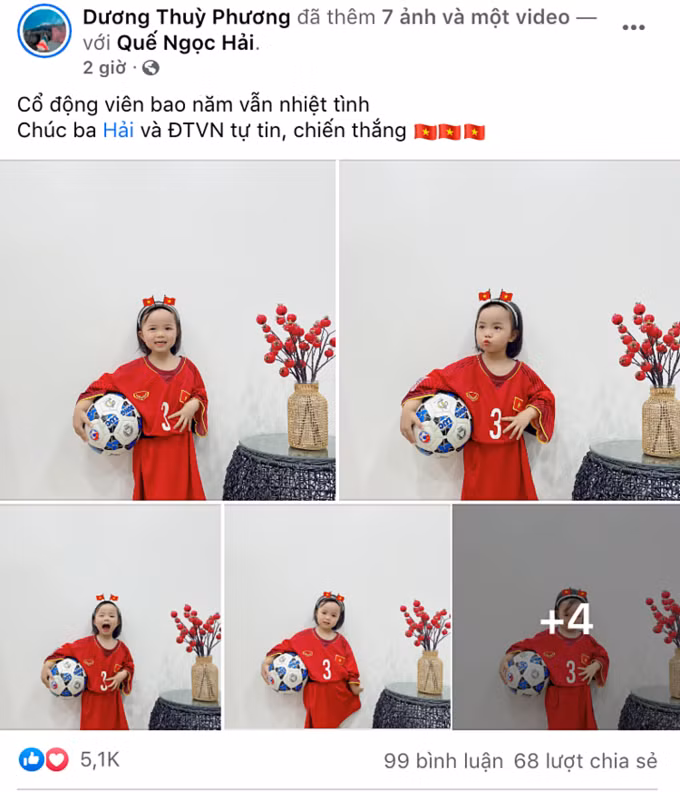 Đi kèm với những lời chúc, "cựu" hot girl Đại học Vinh còn đăng tải hình ảnh bé Sunny mặc chiếc áo thi đấu của đội tuyển Việt Nam để cổ vũ "ba Hải" ở quê nhà.