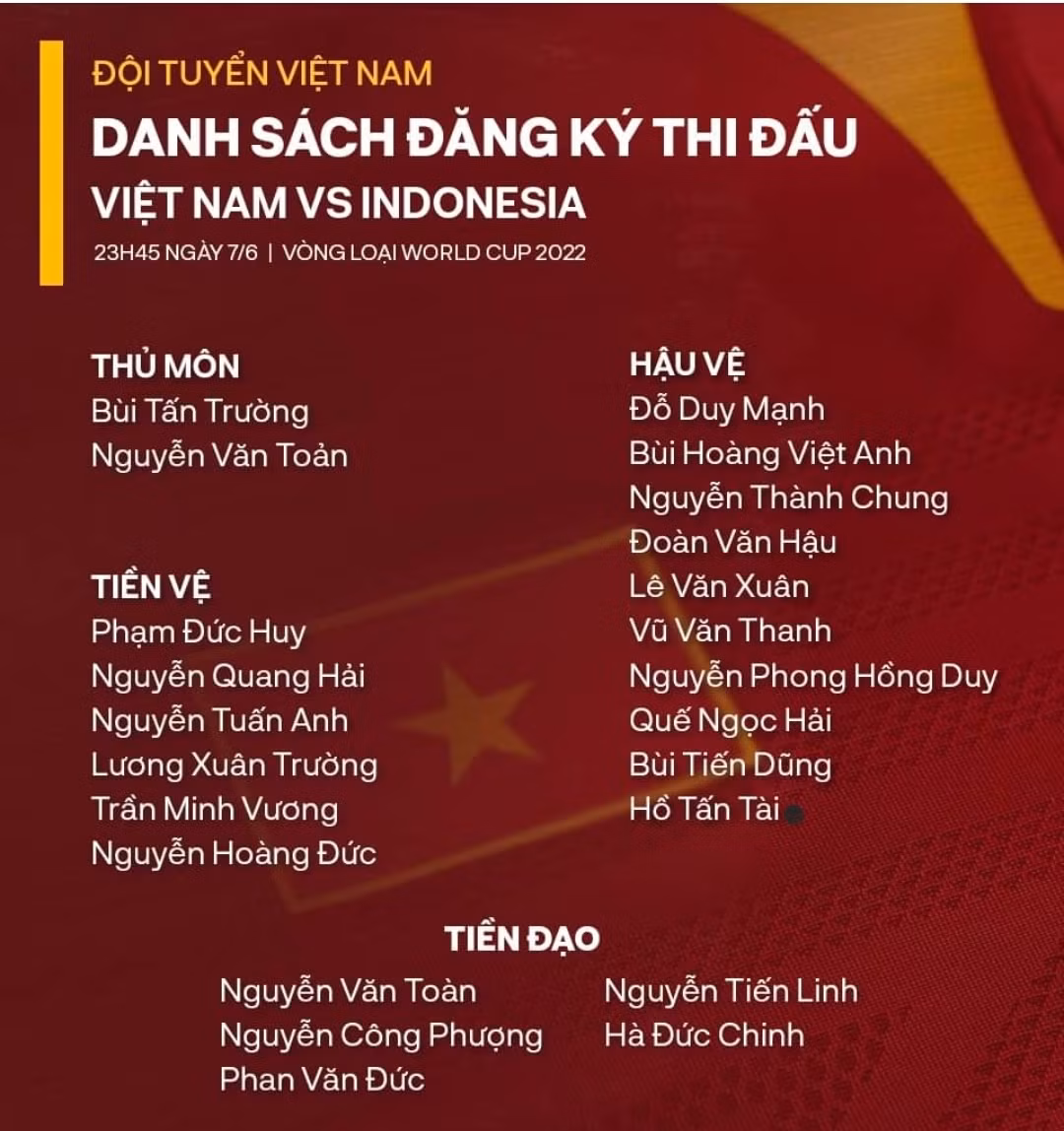 Danh sách đăng ký của ĐT Việt Nam trước Indonesia