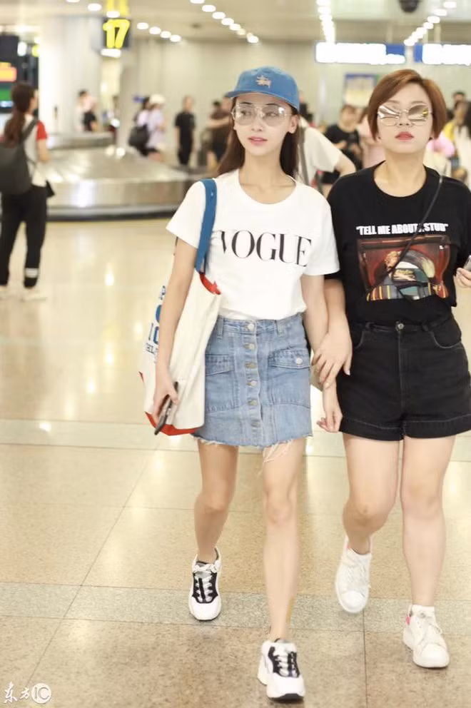 Style sân bay trẻ trung, năng động cùng áo phông và chân váy jeans lại khiến cô lộ rõ đôi chân khẳng khiu, đầu gối củ lạc.