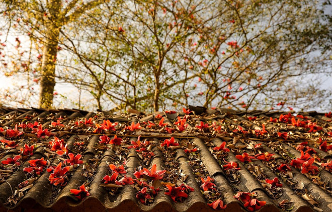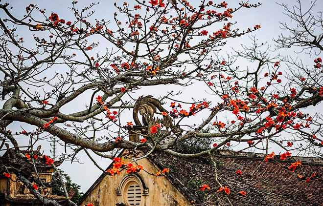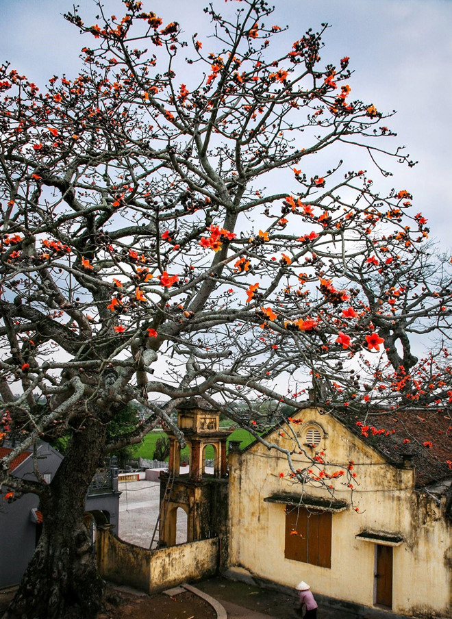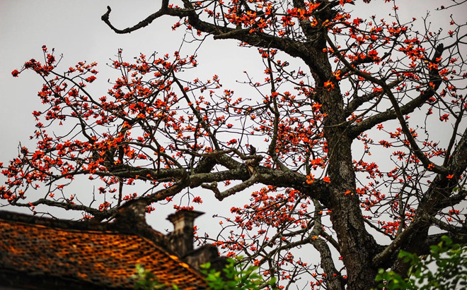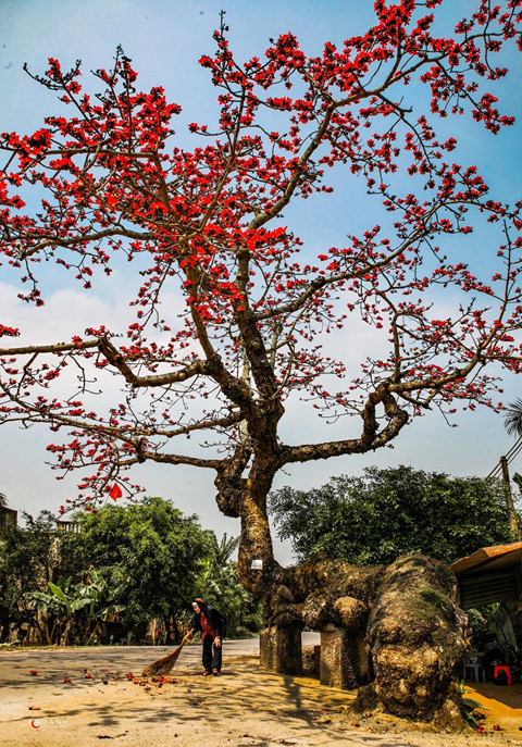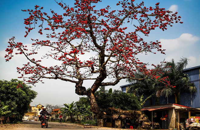 Tháng 3 về, những cây gạo trút lá, đơm hoa đỏ rực như hàng nghìn đốm lửa lưng trời, tạo điểm nhấn ấn tượng, đặc biệt trong khung cảnh làng quê yên ả, thanh bình.