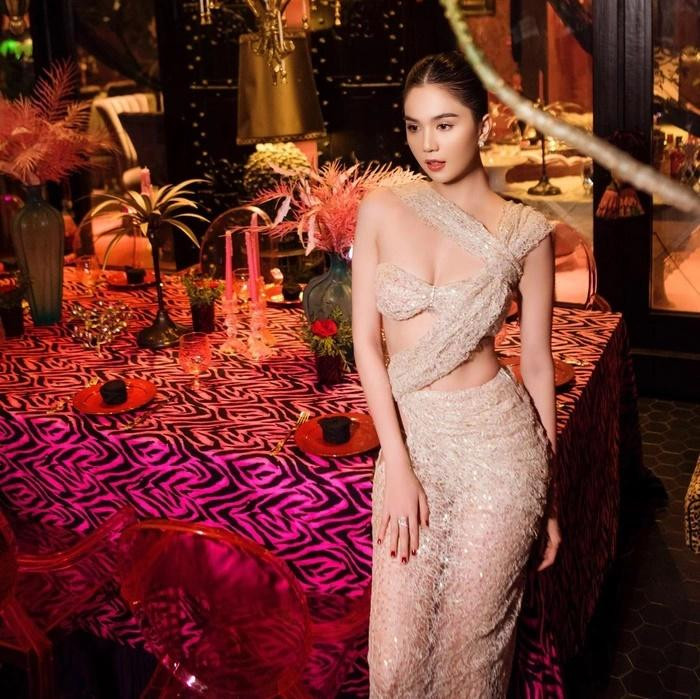uất hiện với tư cách là khách mời nhưng Ngọc Trinh cũng dìm "sương sương" chủ tiệc vì bộ trang phục mỏng manh.