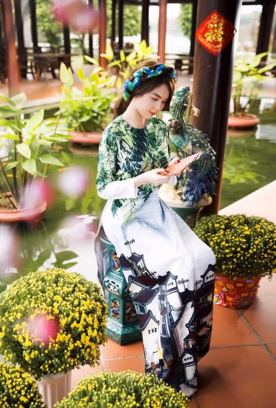 Đây là bộ ảnh tràn ngập không khí đón Tết Bính Thân 2016 do Ngọc Trinh và ê-kip của mình thực hiện. Khác với những bộ cánh sexy hay những chiếc đầm lộng lẫy, Ngọc Trinh dịu dàng, nữ tính và quyến rũ hơn trong trang phục áo dài truyền thống vừa kín đáo vừa khoe khéo những đường cong mềm mại của cô nàng.