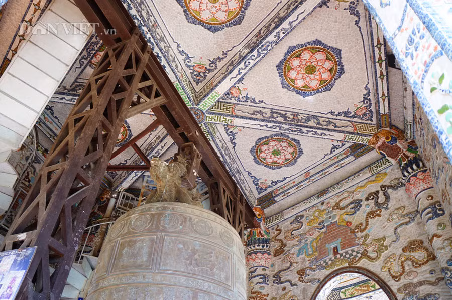 Toàn cảnh ngôi chùa, tháp chuông với những hoạ tiết sắc sảo, tạo nét riêng biệt bởi chất liệu từ mẻ chén, ve chai.