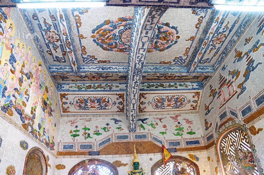 Vẻ đẹp có một không hai của ngôi chùa Linh Phước là phong cách kiến trúc độc đáo, lạ mắt, được trang trí toàn bằng mẻ chén, ve chai.