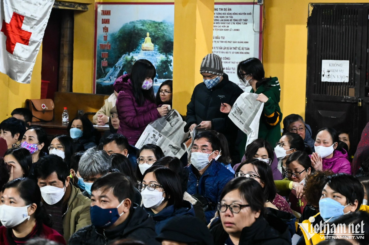 Thời tiết tại Hà Nội khá lạnh, chỉ từ 12 -14 độ C, nhiều người vẫn cố gắng ngồi ngoài trời ít nhất 2 tiếng từ khi chờ đến lúc nhà sư tụng kinh làm lễ.