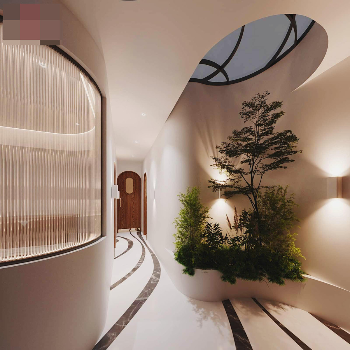 Các lối dẫn lên tầng là giếng trời lấy gió, ánh sáng và lưu thông không khí. Cầu thang xoắn ốc mềm mại.