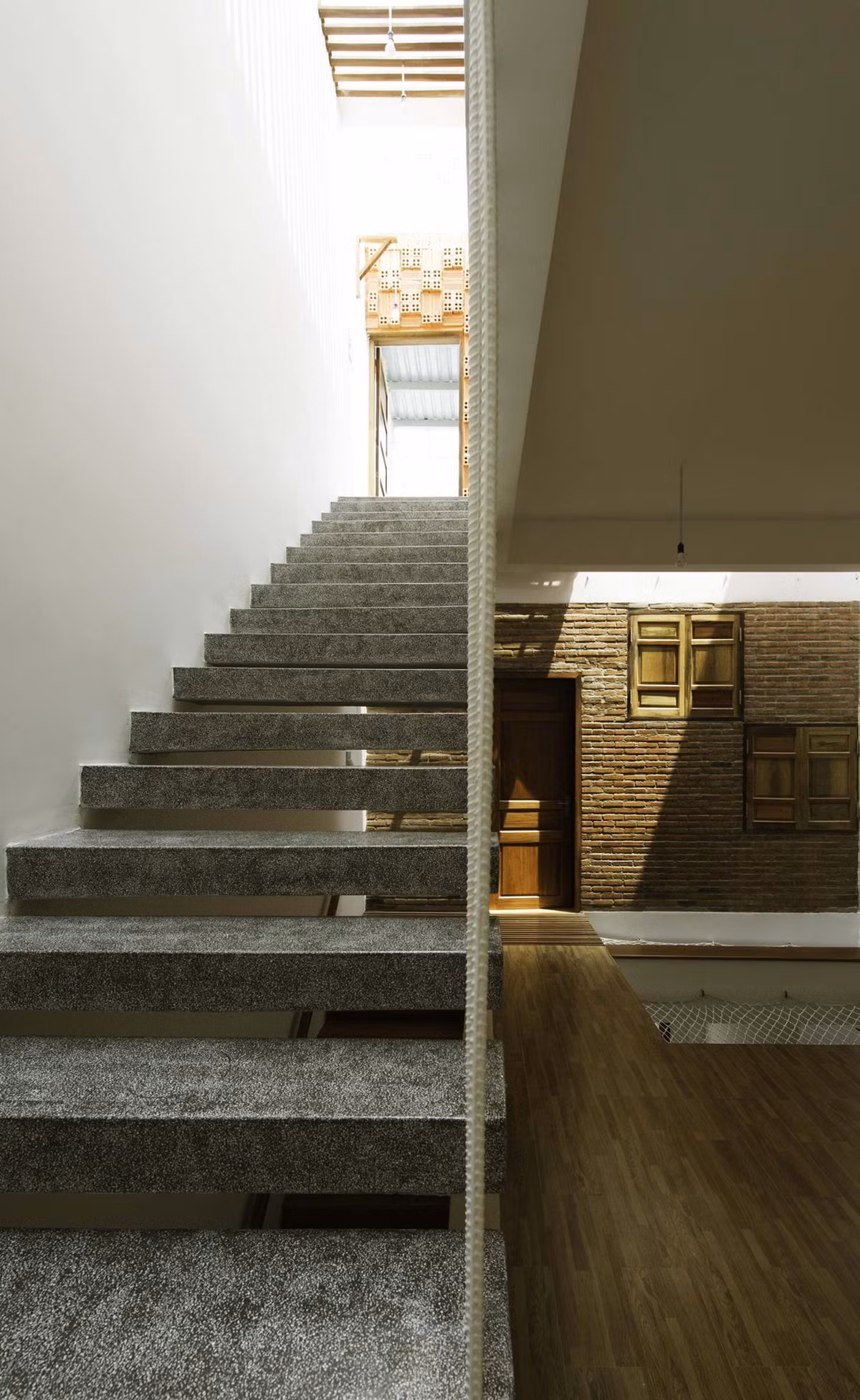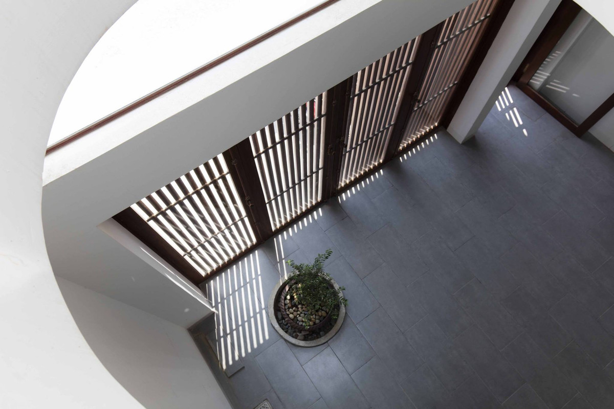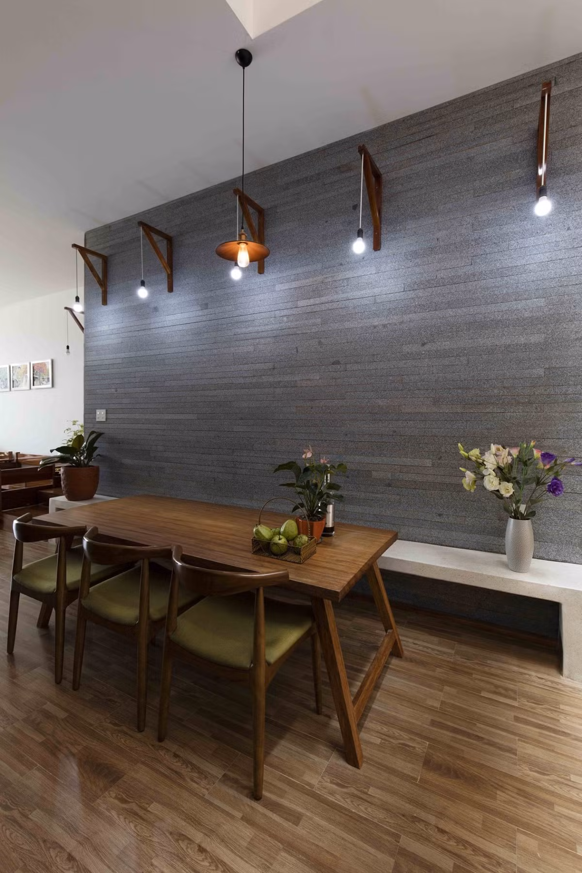 Một không gian thuần Việt, mang nặng tâm tư và triết lý sống của gia chủ. Hướng Tây là một bất lợi nhưng các kiến trúc sư đã biến điều bất lợi đó thành cái đặc sắc cho căn nhà: Ánh nắng chiếu qua các mảng tường lỗ - tạo thành vệt nắng đầy nghệ thuật.