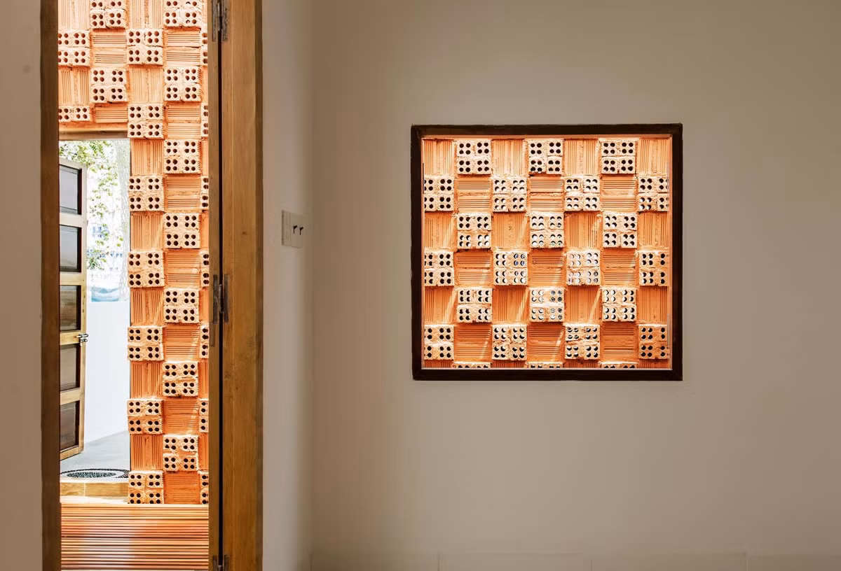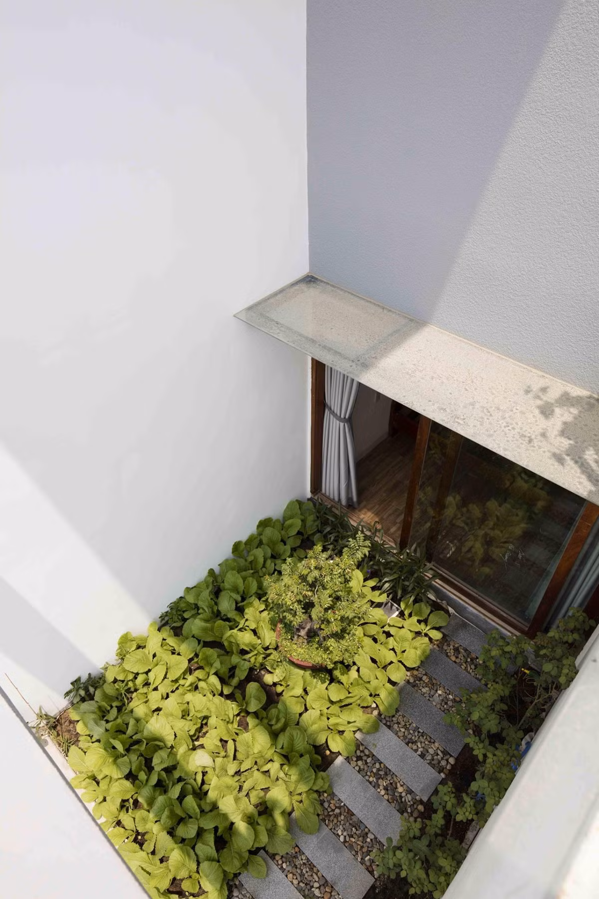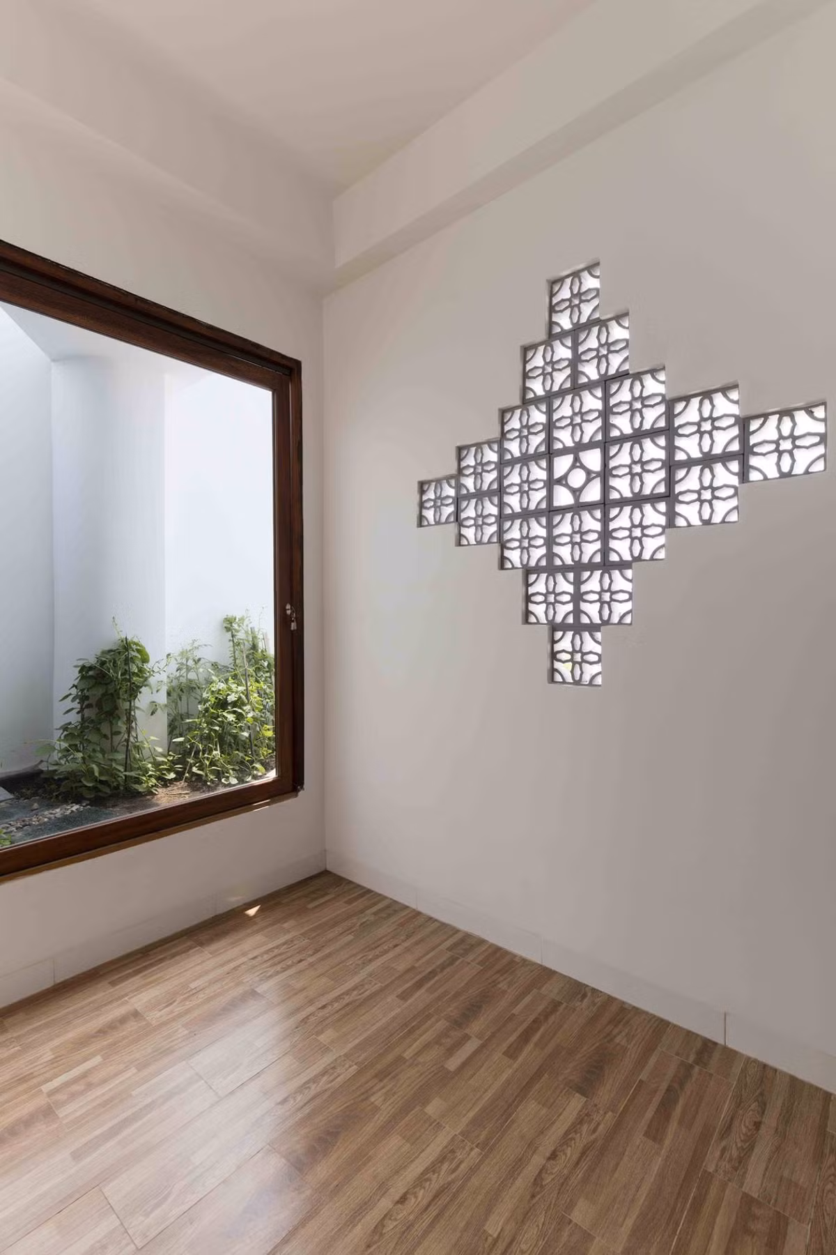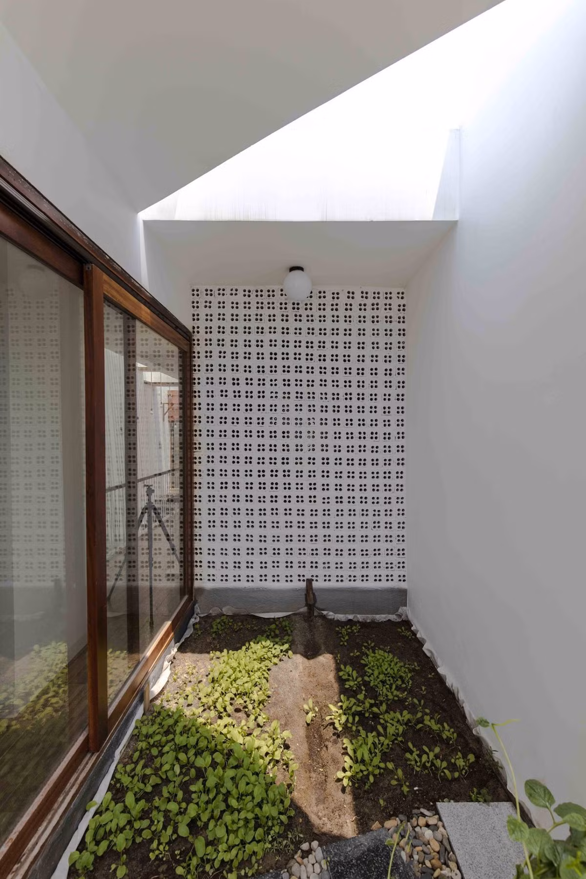 Mảng tường chữ thập, sử dụng gạch lỗ, lưu thông gió từ giếng trời vào nhà. Bên cạnh là khu vườn nhỏ. Ngôi nhà có điểm khá độc đáo là phòng nào cũng nhìn ra được vườn và mảng xanh.