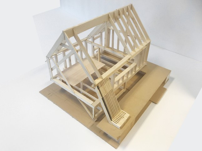 Ngôi nhà nhỏ có kết cấu hoàn toàn bằng gỗ được dựng ở lưng đồi với phần móng là 6 bu-lông được khoan chặt vào đá. Ngôi nhà có đủ các tính năng cần thiết nhất cho cuộc sống sinh hoạt cơ bản.