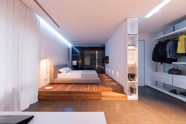 Phòng ngủ được thiết kế như 1 sân sân khấu, không gian mở mà vẫn ấm cúng.