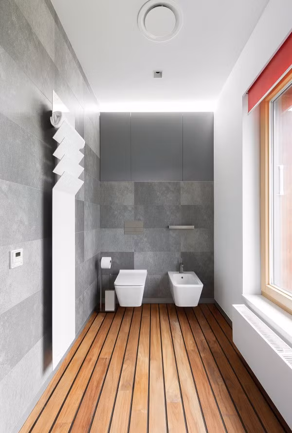 Phòng tắm được thiết kế với đá cẩm thạch màu đen kết hợp với sàn gỗ tạo nên sự hoàn hảo cho không gian này.