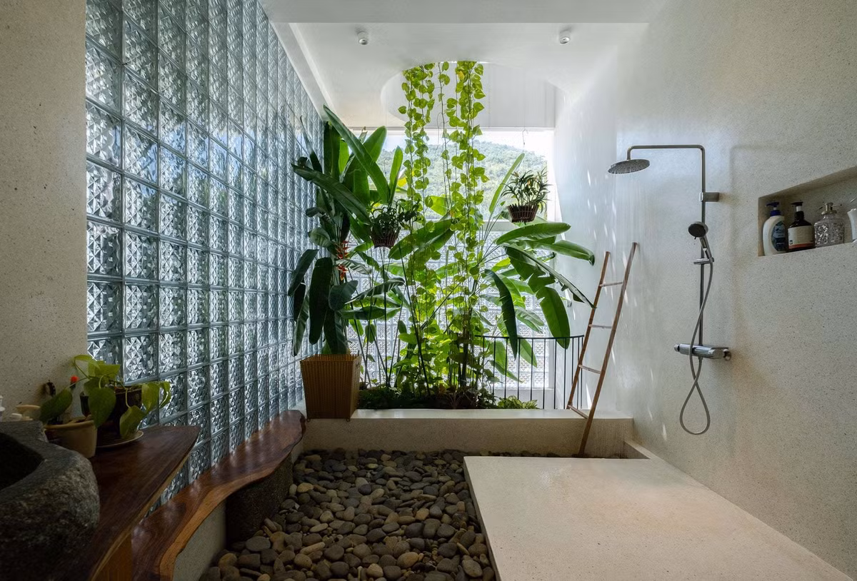 Cuộc sống hòa hợp với thiên nhiên là ý tưởng xuyên suốt của công trình nên mọi không gian đều được bố trí mảng xanh. Phòng tắm nằm sát giếng trời, trải sỏi gây ấn tượng mạnh với bất cứ ai khi bước vào tham quan công trình.