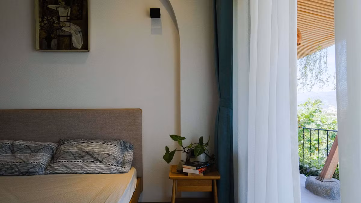 Gian bếp với ô cửa lớn mở ra khoảng trời xanh màu cây lá. Hay những phòng ngủ sau hàng hiên lam gỗ, riêng tư ý nhị qua lớp cửa song lam... Ngôi nhà nép mình bên dòng sông thật đẹp dưới chân ngọn núi mỗi chiều hoàng hôn.