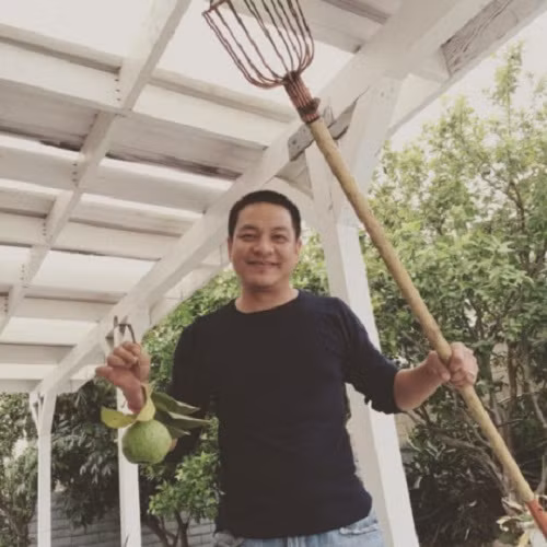 Ông xã Kim Hiền vui vẻ hái quả để cả gia đình cùng thưởng thức.