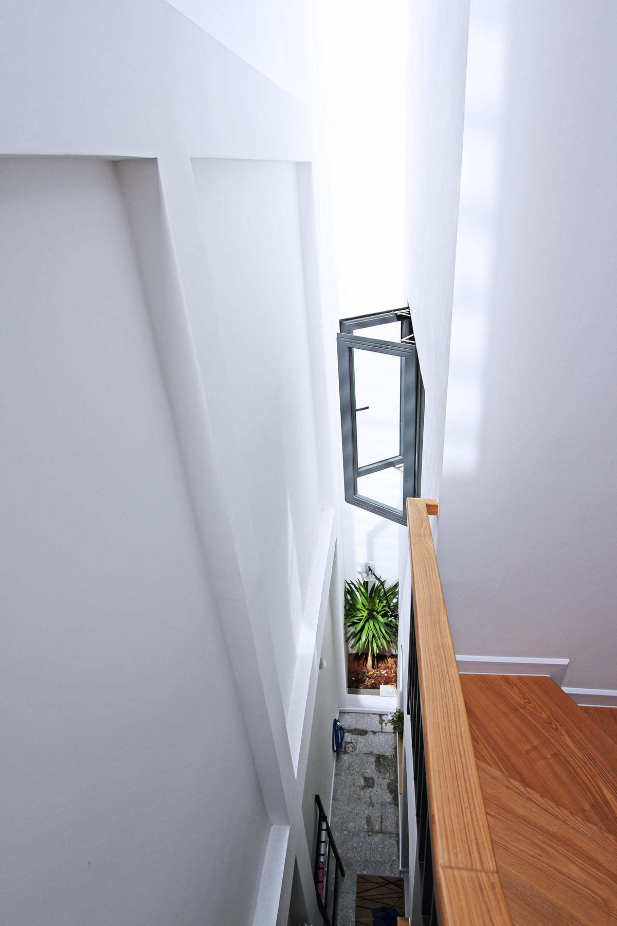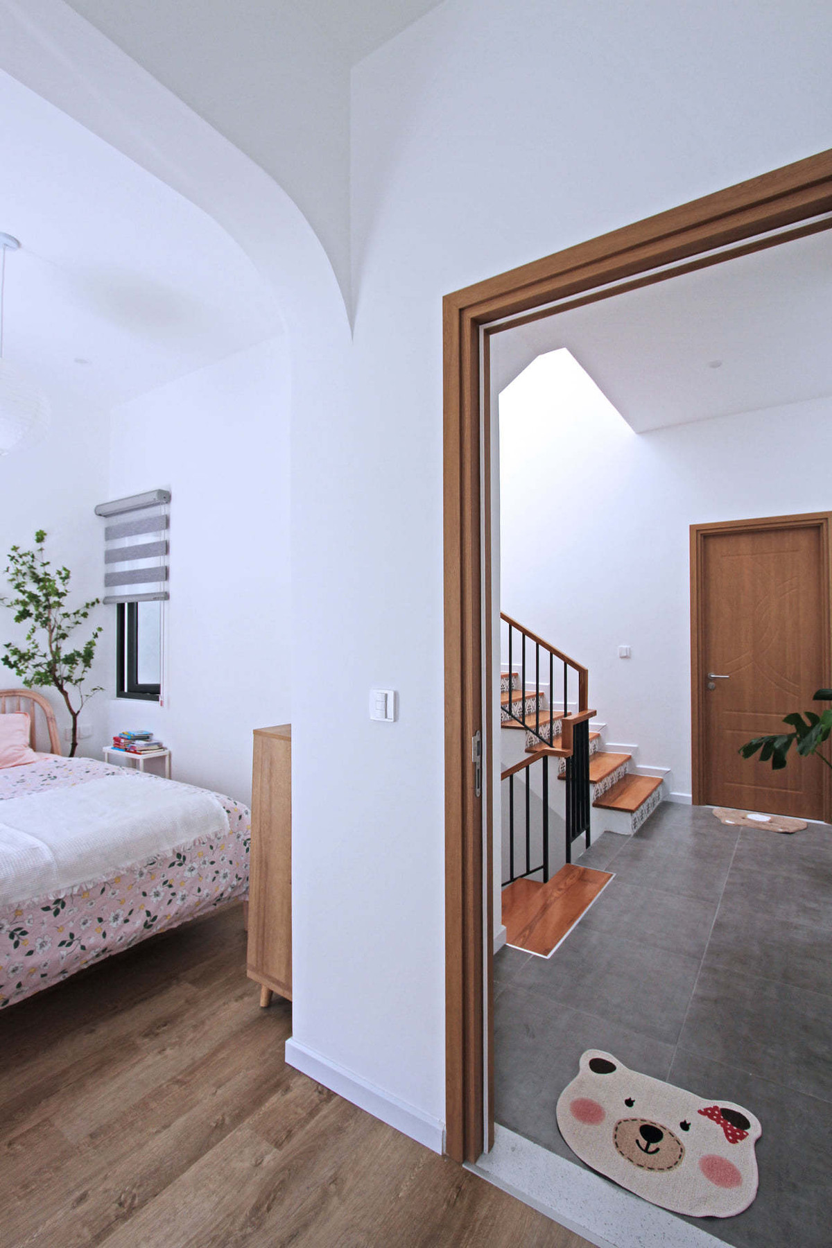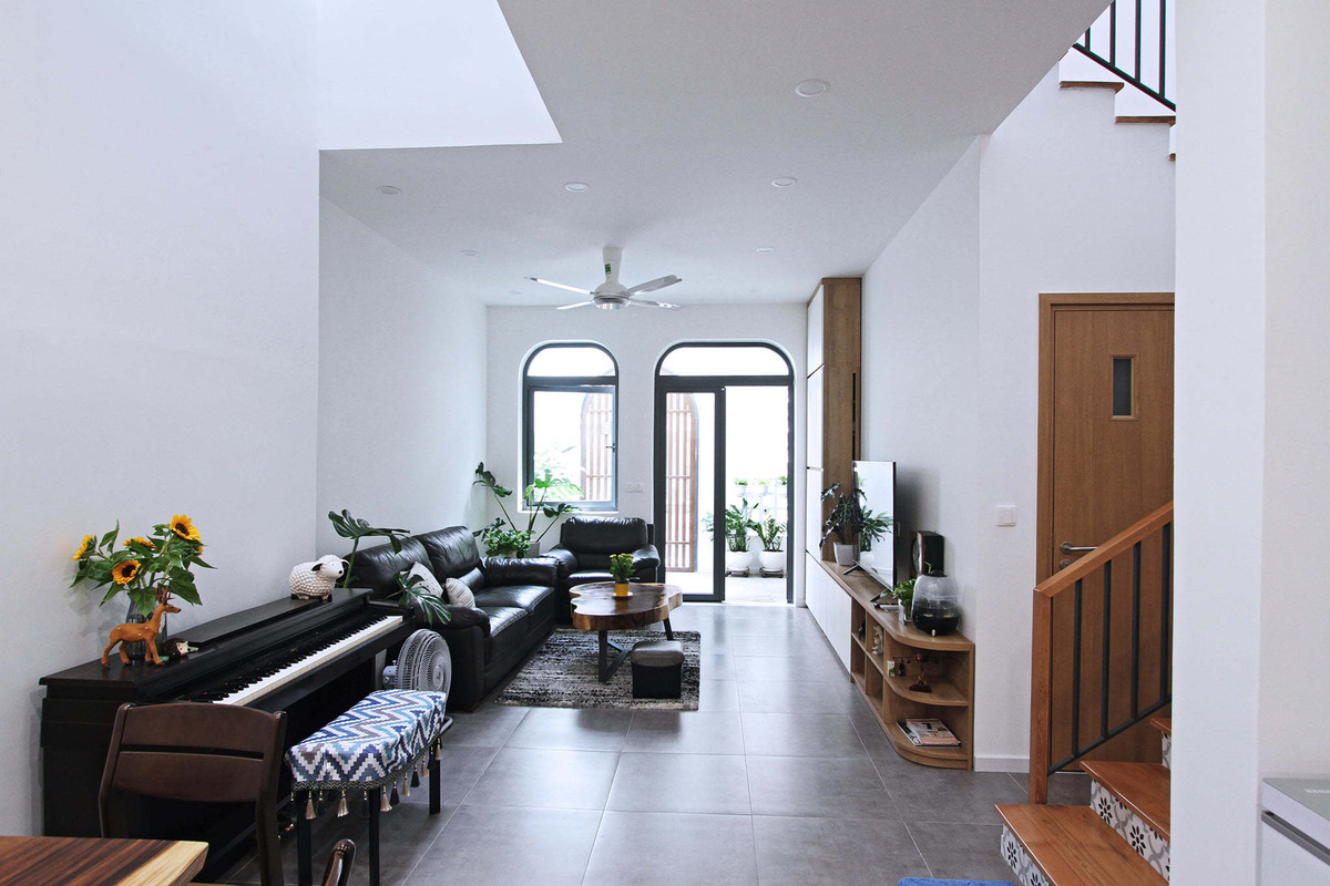 Phòng nào cũng có khí tươi và ánh sáng tự nhiên ùa vào thông qua các khoảng không, giếng trời. Bậc cầu thang ốp gỗ ấm cúng, không bị trơn trượt.