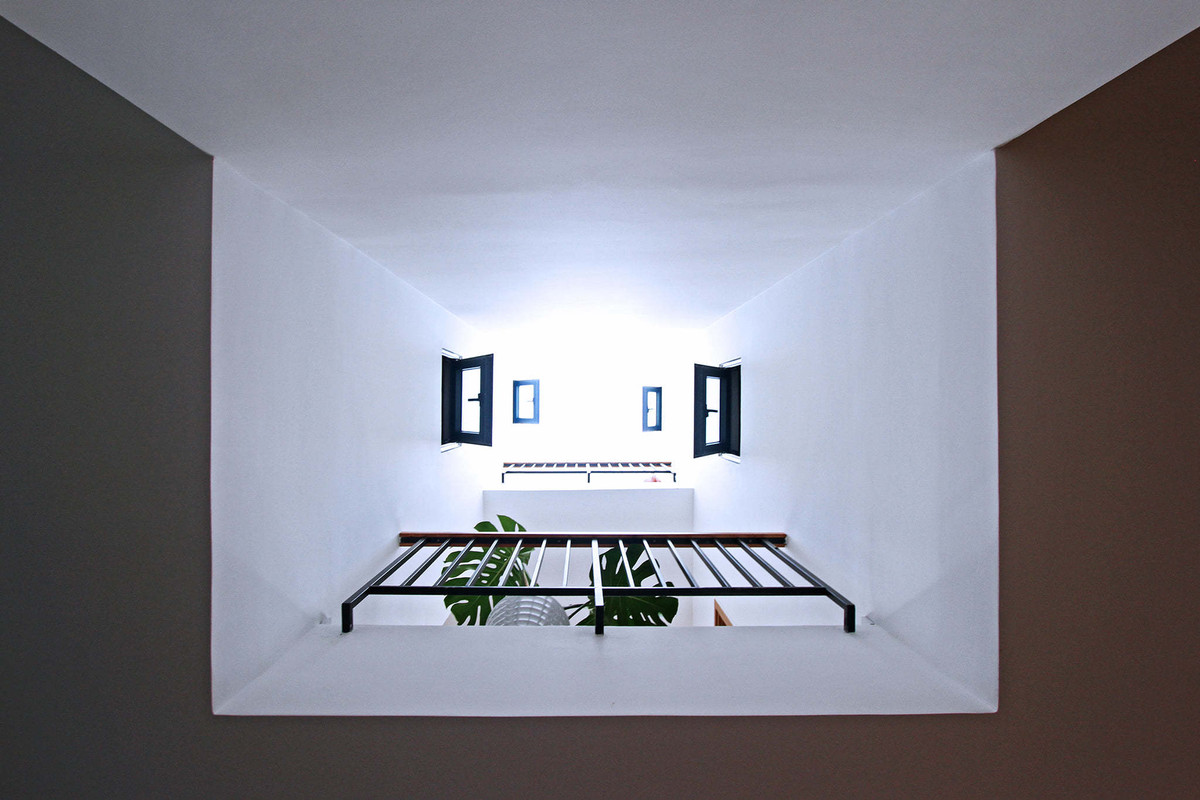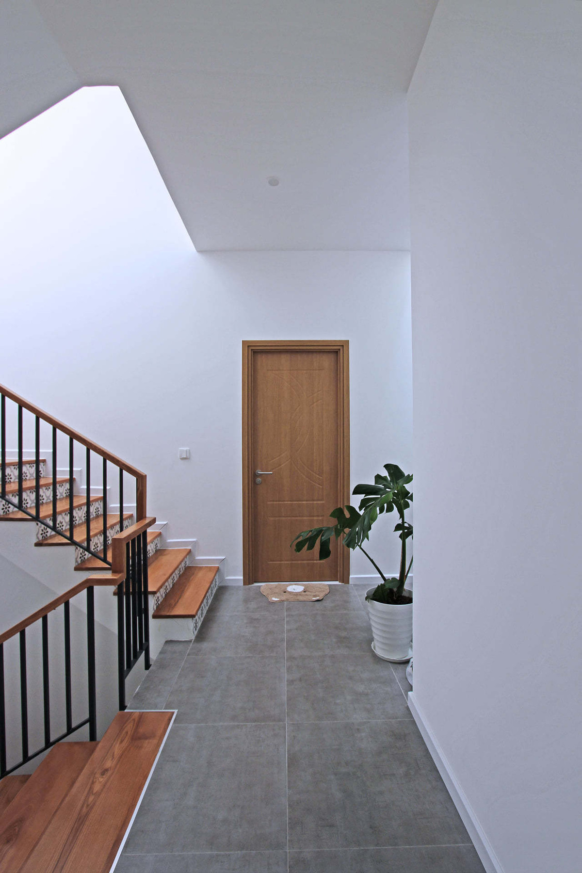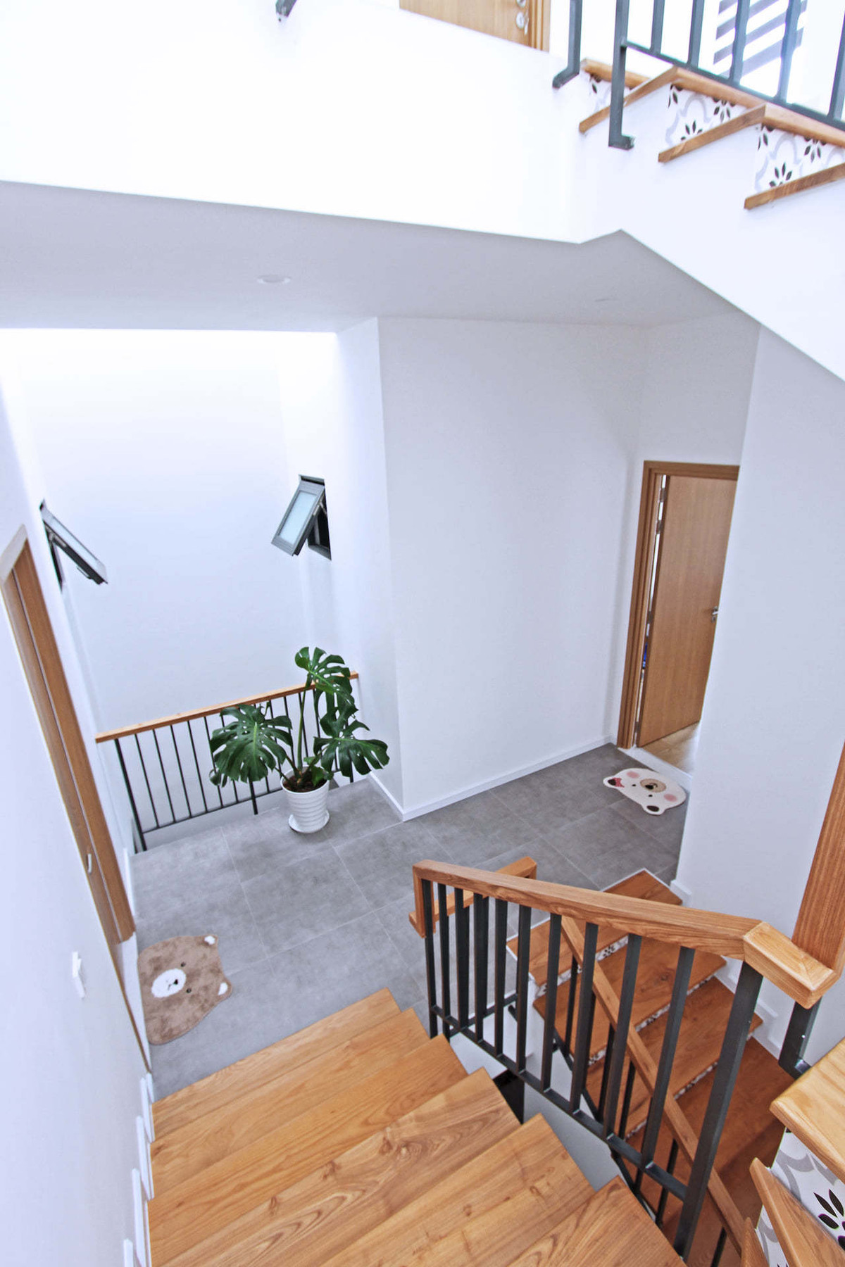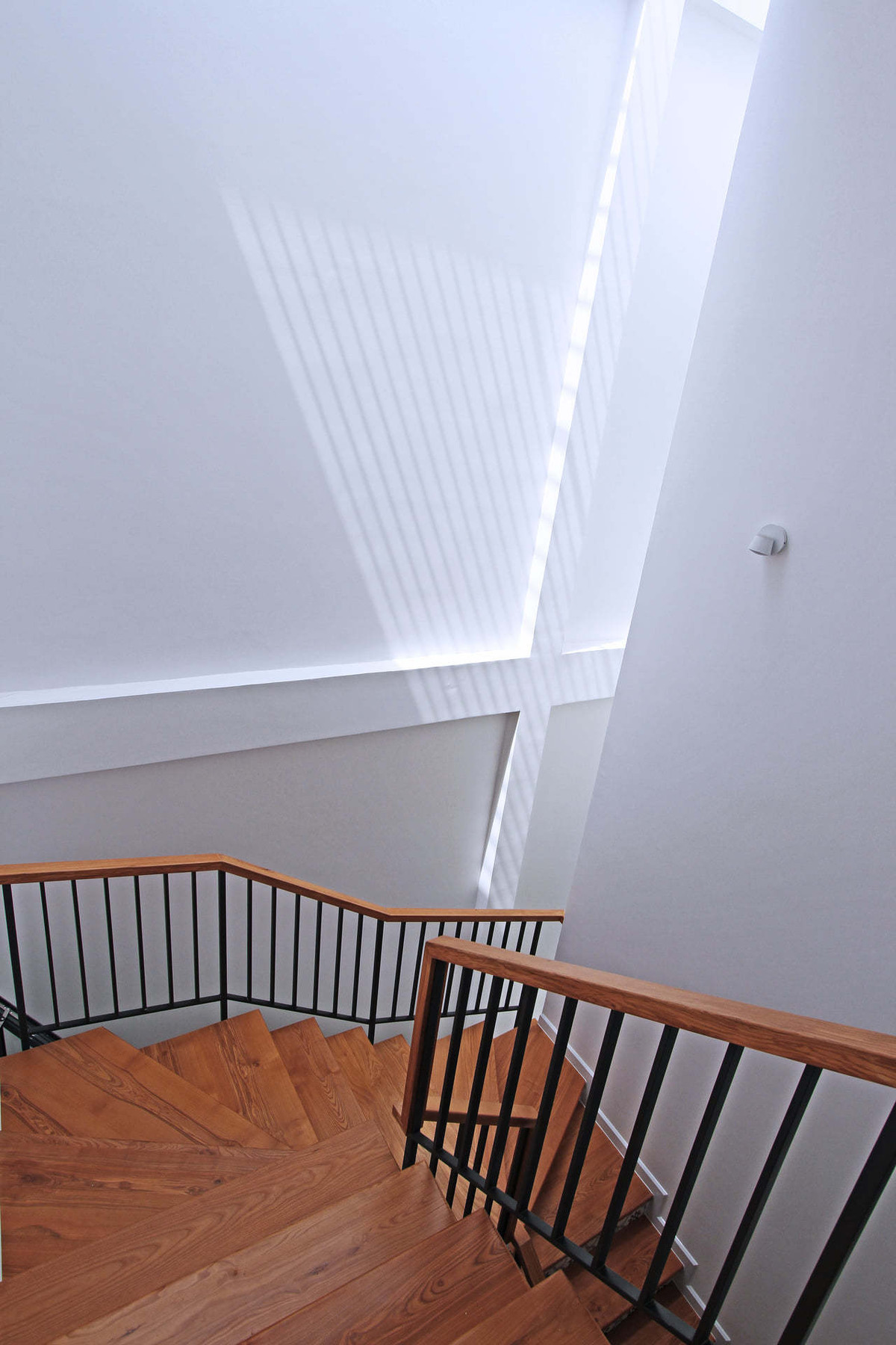 Phòng nào cũng có khí tươi và ánh sáng tự nhiên ùa vào thông qua các khoảng không, giếng trời. Bậc cầu thang ốp gỗ ấm cúng, không bị trơn trượt.