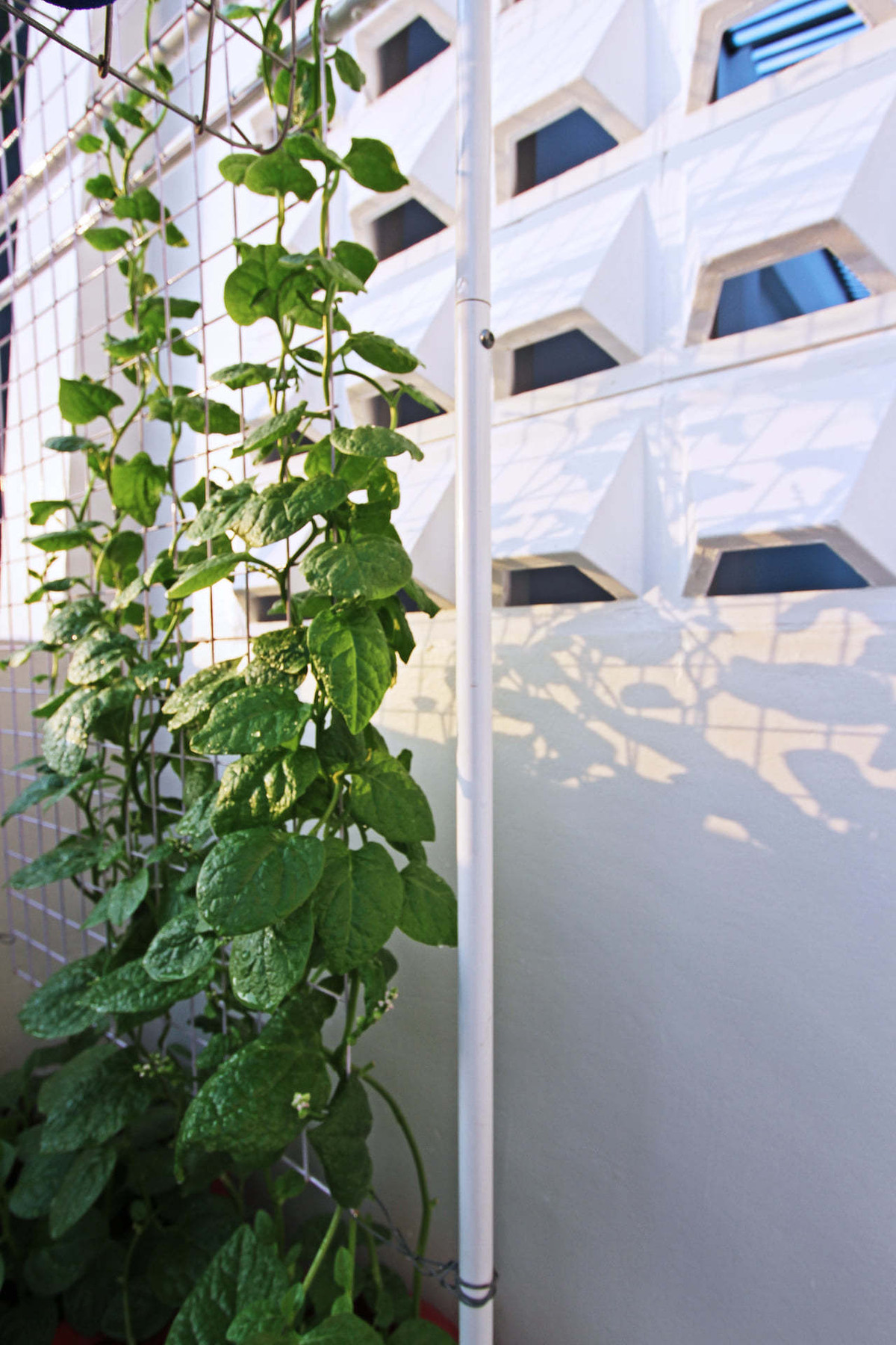 Thảm cây xanh đổ xuống từ các tầng, dự kiến 1 thời gian nữa sẽ phủ kín ban công, có chức năng lọc bụi cho nhà.