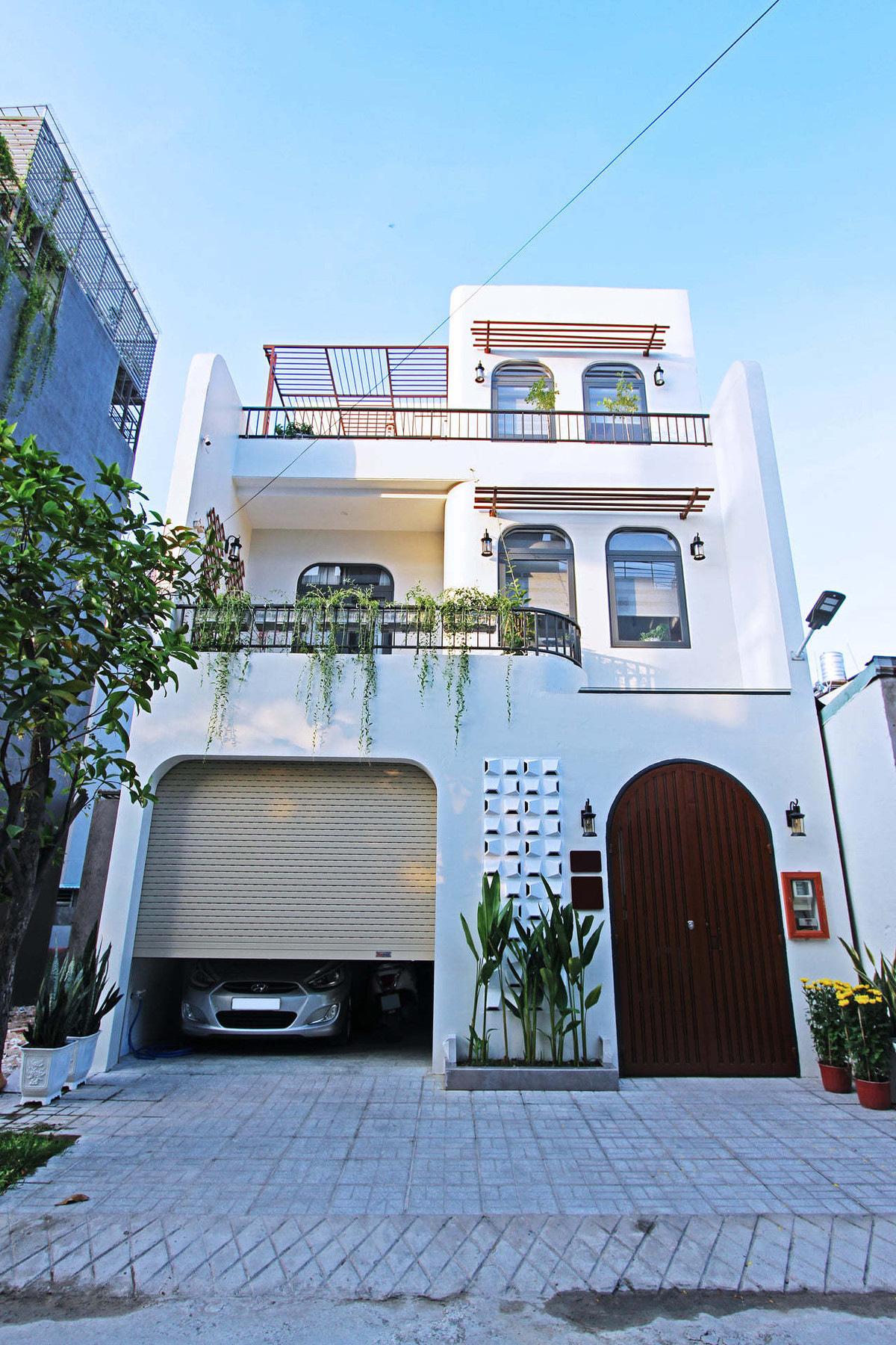 Mặt tiền ngôi nhà phân ra làm hai phần. Một bên là cửa gara, một bên là cửa ra vào.
