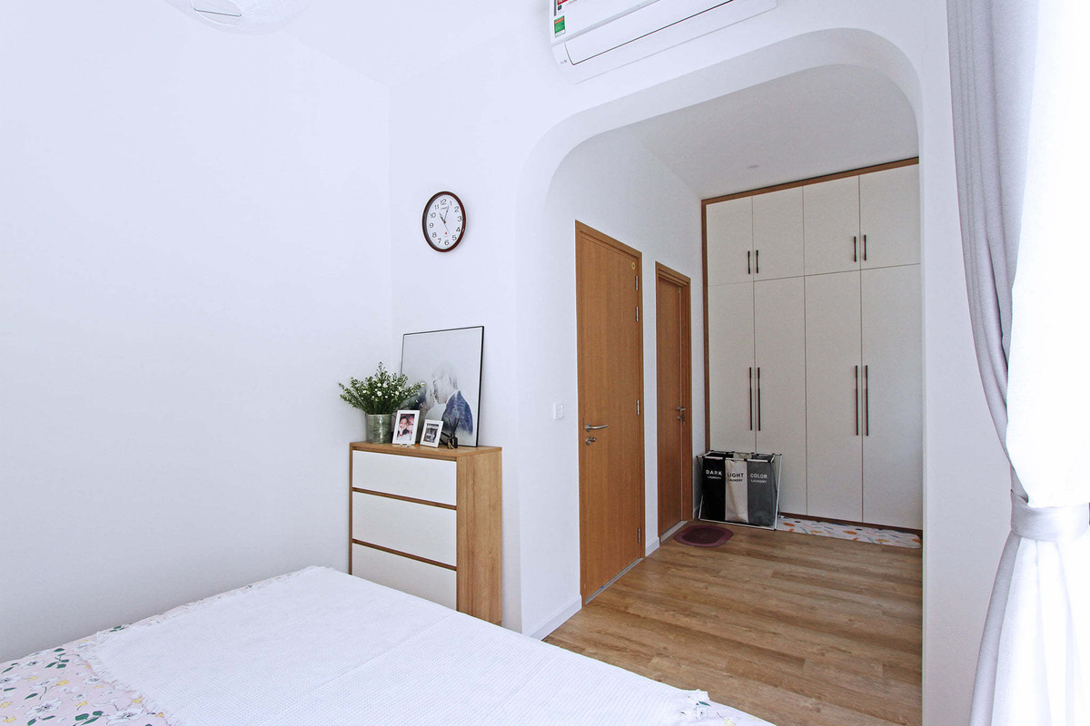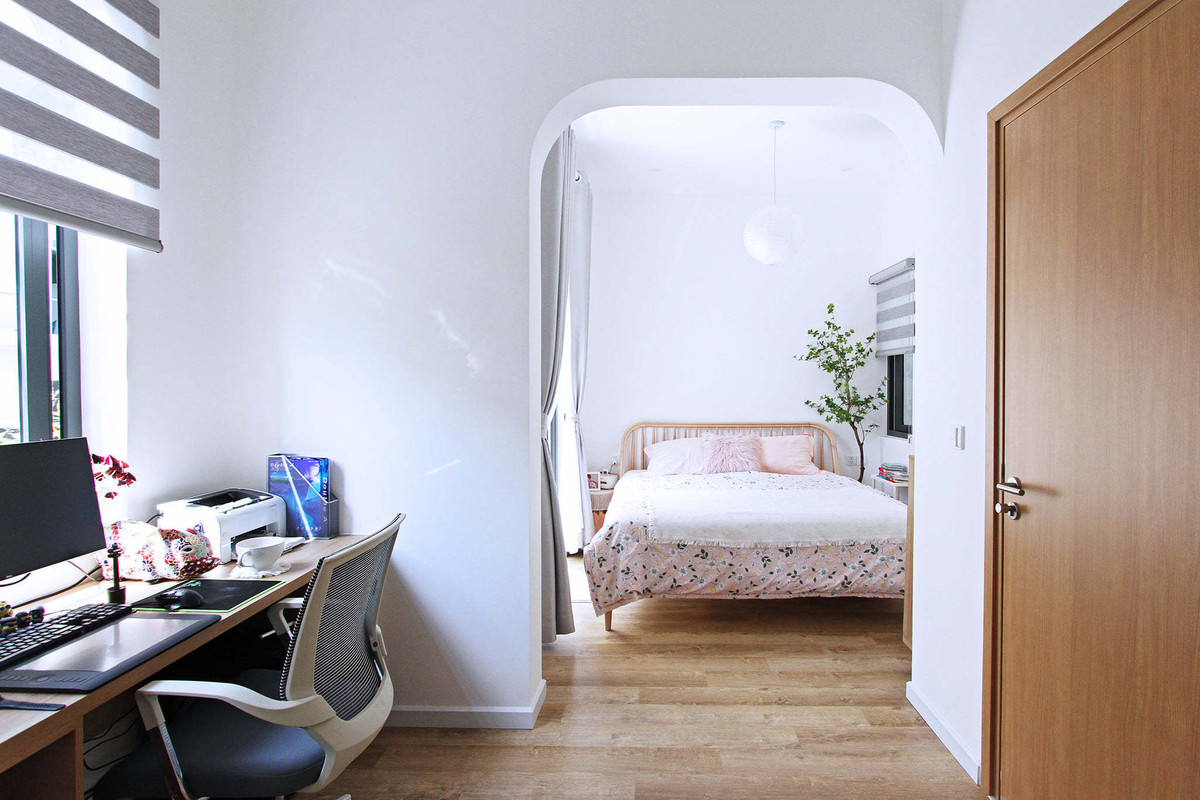 Phòng ngủ dùng ga giường màu hồng làm điểm nhấn.