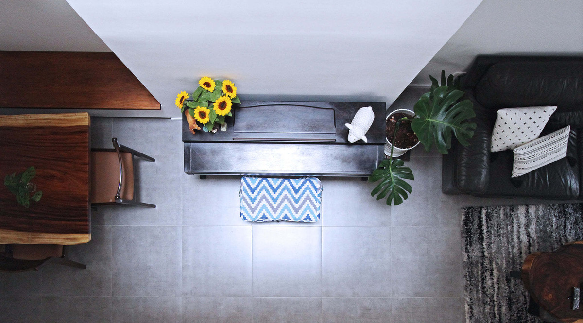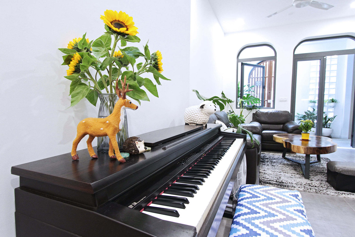 Đàn piano đặt dưới giếng trời luôn nhiều ánh sáng, tạo cảm hứng cho mỗi bản nhạc.