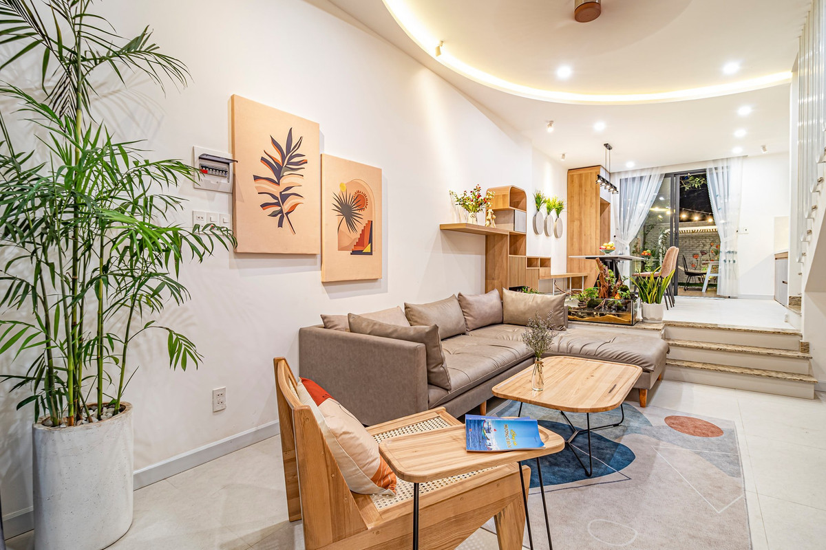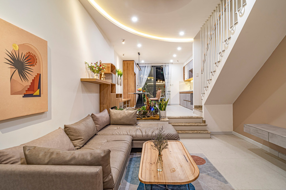 Phòng khách thông ra vườn sau nên gió luôn đối lưu, mát lạnh và trong lành. Nội thất chị Dung tự decor, thiết kế theo ý mình nên không có sự trùng lặp với các công trình khác. Bếp cao hơn phòng khách, phân biệt ranh giới giữa hai không gian, đồng thời giúp cầu thang rút ngắn các bậc lại, thuận tiện cho gia chủ khi lên xuống.