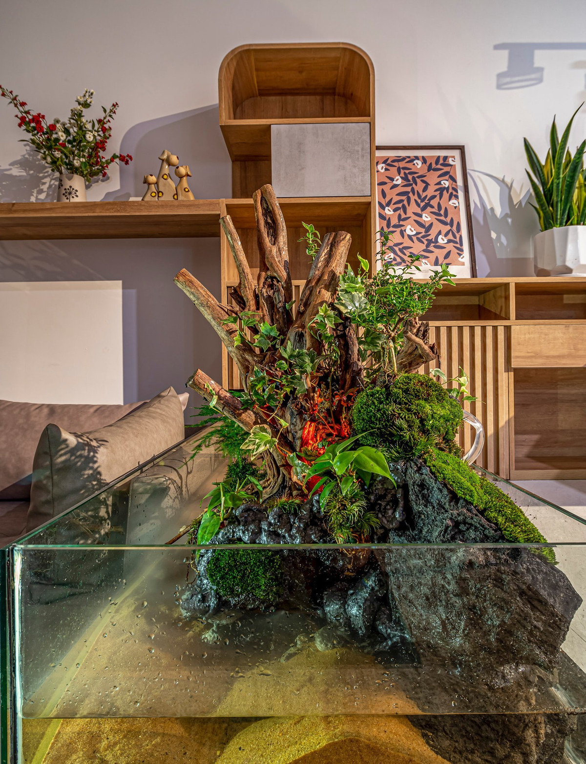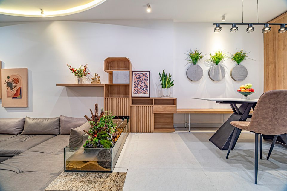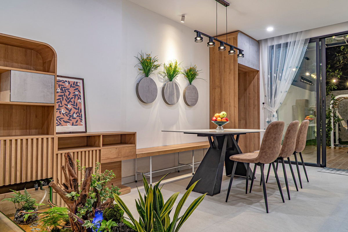 Cây xanh, bể cá và tiểu cảnh đẹp mắt, làm phong phú các góc nhìn cho không gian.