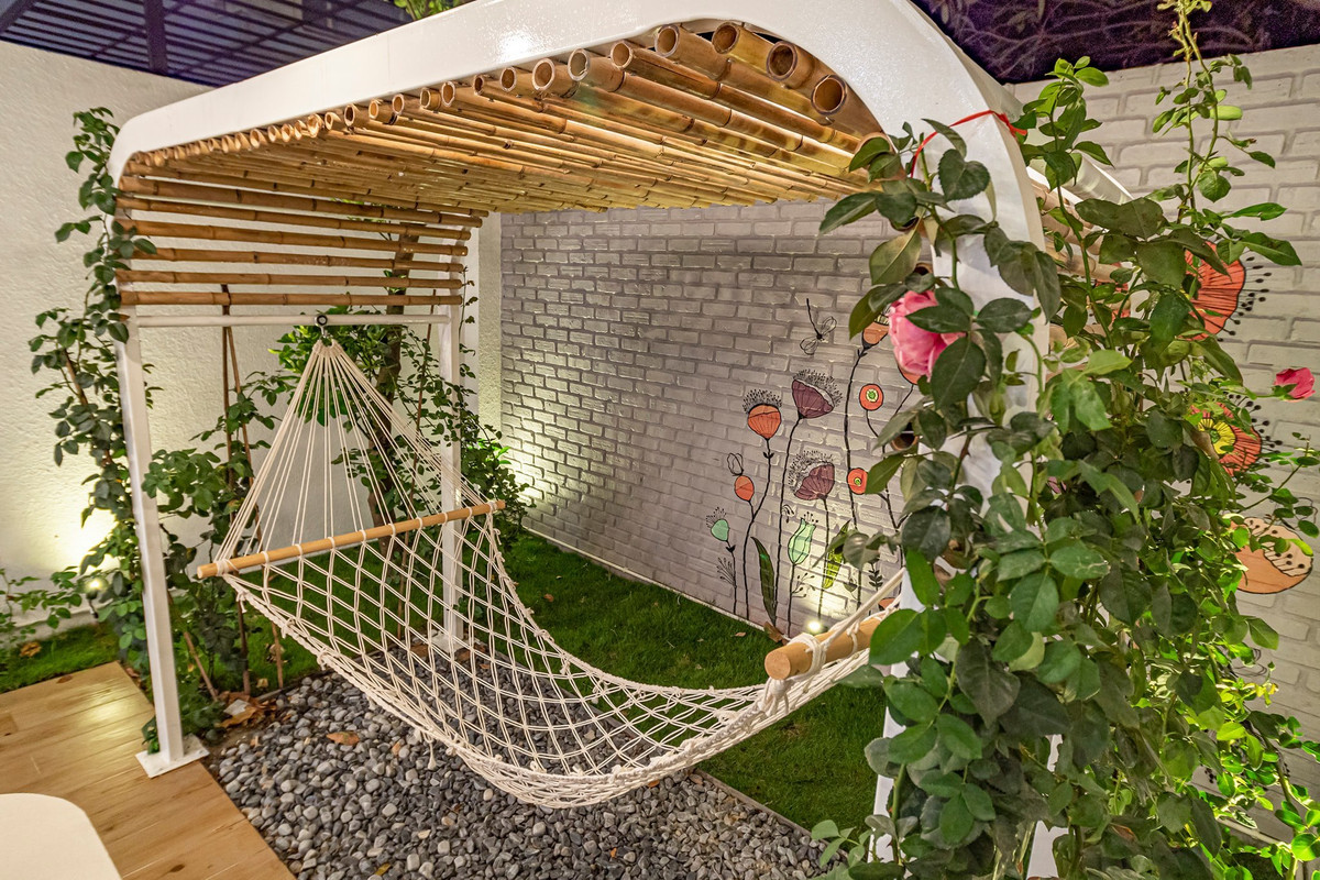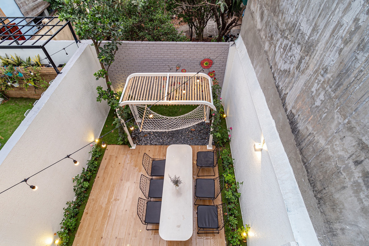 Sân vườn mini sau nhà để tổ chức các bữa tiệc ngoài trời hay đơn giản là cả gia đình quây quần ăn tối khi thời tiết mát mẻ. Chiếc võng đu đưa màu trắng gây thích thú cho các bạn nhỏ với khung sắt kiên cố làm theo đặt hàng, phần võng vặn thừng mua riêng và mắc lên.